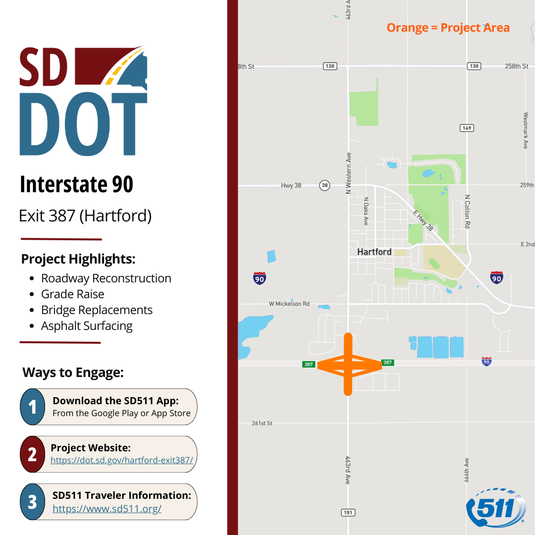 This project will include reconstructing the standard diamond interchange at exit 387 and replacing the structure over I-90. Western Avenue will be reconstructed as a three-lane roadway with a center left-turn lane, curb and gutter, sidewalk, and a shared use path. Additionally, the City of Hartford will have a project starting that extends the reconstruction of Western Avenue from Diamond Trail to the north of Mickelson Road. Motorists are asked to stay alert for workers, equipment, and slowed traffic through the work zone.