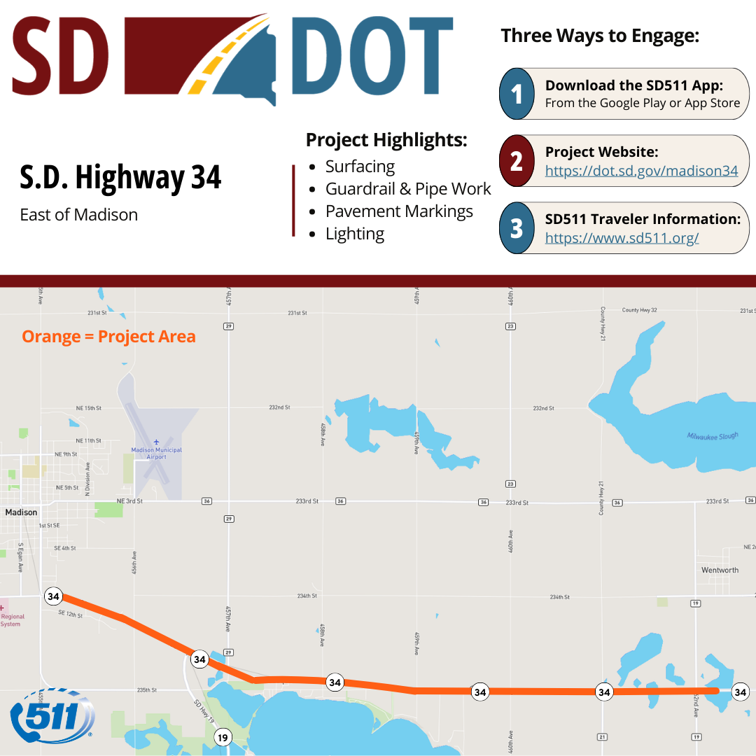 The project includes cold milling the existing asphalt concrete and placing new asphalt surfacing on S.D. Highway 34 to provide a smoother, safer ride.