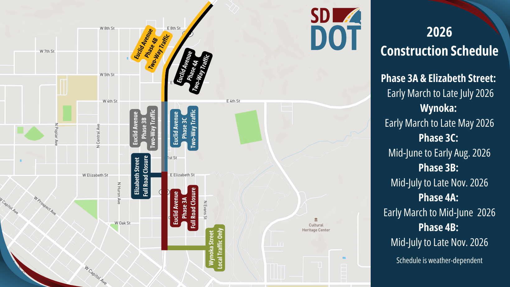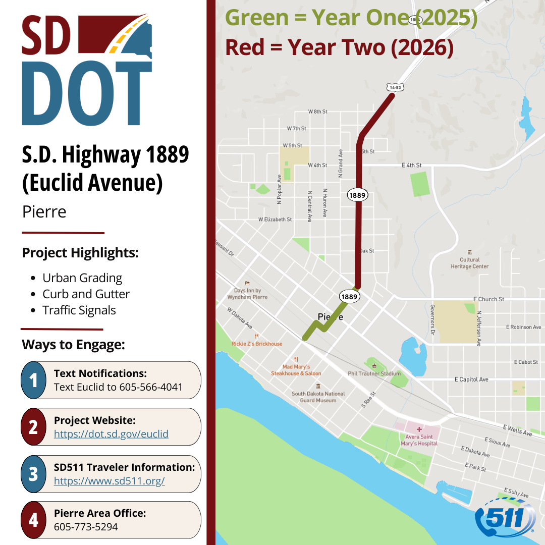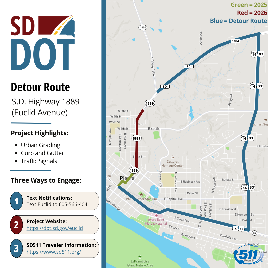 On Thursday, Feb. 19, 2026, the South Dakota Department of Transportation (SDDOT), in collaboration with the City of Pierre, and Morris, Inc., will hold an informational meeting to discuss the second year of reconstruction on Euclid Avenue in Pierre. The meeting, which will include construction timelines and traffic changes, is scheduled to begin at 6 p.m. at Faith Lutheran Church, located at 714 North Grand Ave. in Pierre. The informational meeting is designed to share project information and answer questions for members of the public including impacted residents, local businesses, and emergency service personnel.